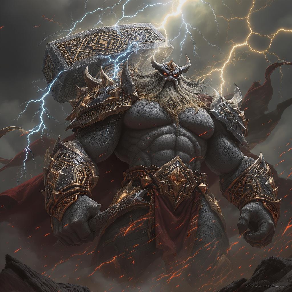 Baelgor, a formidable Goliath warrior, stands tall with a commanding presence and an unyielding spirit. His stone-like skin and intense gray eyes reflect his deep connection to the elemental forces of the earth. Armed with a colossal warhammer engraved with mysterious runes, it hums with the power of thunder and lightning. Baelgor demonstrates unwavering loyalty to his allies and an unshakable commitment to justice. The cinematic scene captures him with vivid clarity, highlighting his dramatic and masterful form.