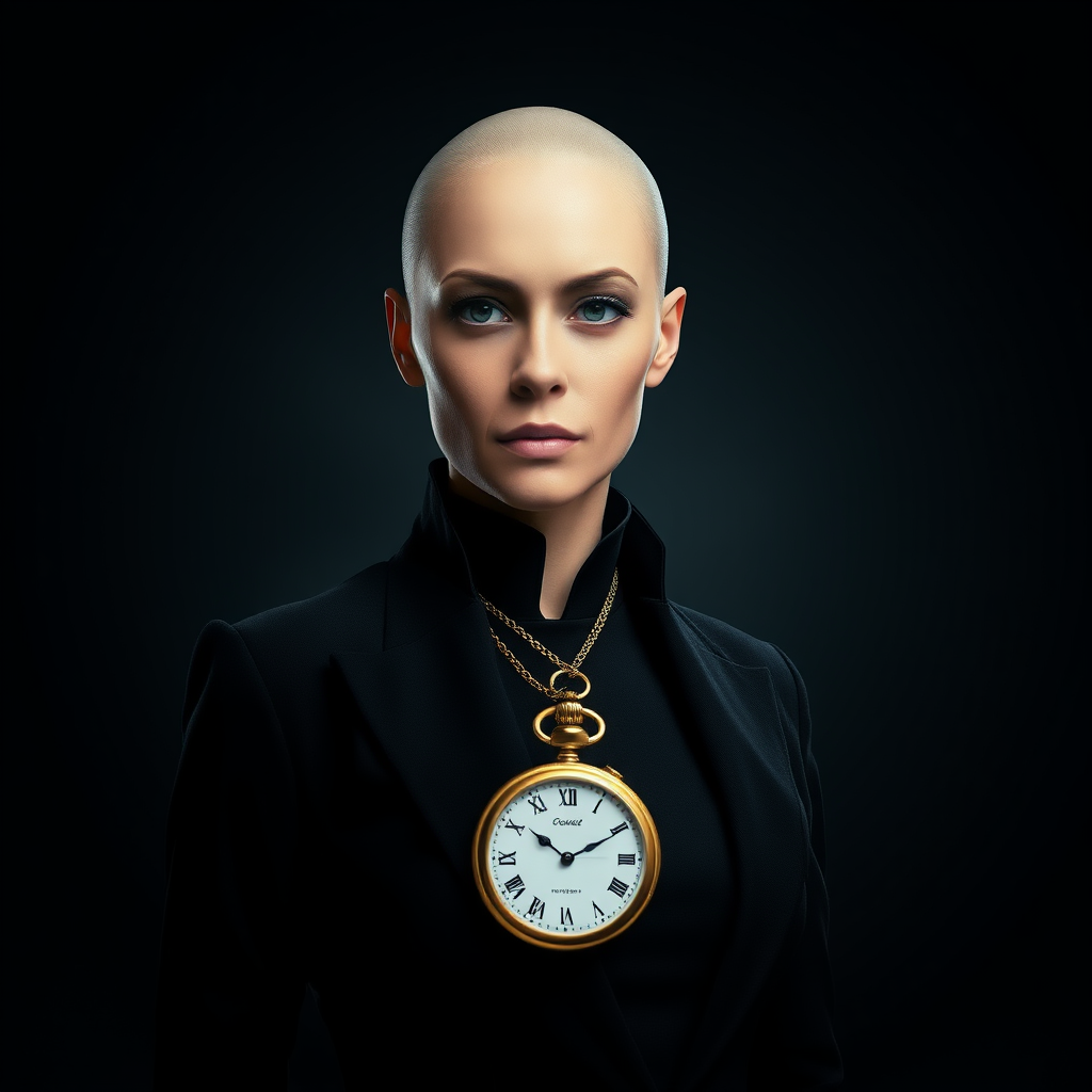 Bald woman standing in full height with a luxurious gold pocket watch hanging around her neck, set against a deep black background, rendered in high detail 3D realism, cinematic lighting enhancing her features, delivering a dramatic and sophisticated aura --aspect ratio 9:16.