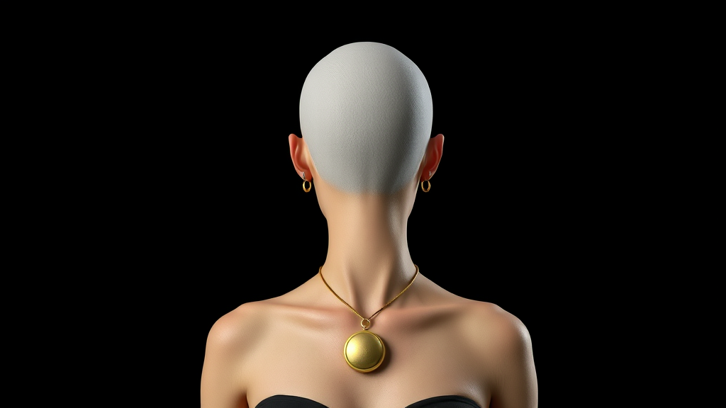 Bald woman standing in full view with a gold pendant hanging around her neck against a deep black background, 3D rendering showcasing realism and cinematic lighting, high detail emphasizing the intricate textures and subtle reflections, portrait orientation.