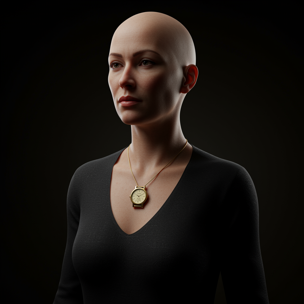 bald woman standing in full view with an elegant gold watch hanging around her neck, set against a dark backdrop, created in 3d with a focus on realism, cinematic lighting, highly detailed render, portrait orientation
