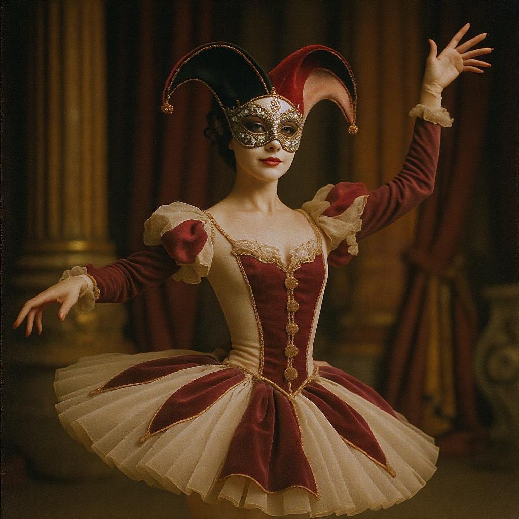 Ballerina, elegant woman, captivating, wearing a harlequin-inspired costume, venetian carnival mask, gracefully dancing, captured in the style of Kodak Portra 800, with a focus on photographic realism and intricate detailing, set against a 9:16 aspect ratio backdrop.
