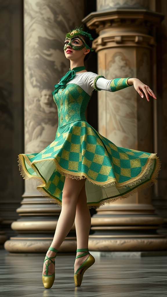 Ballerina in 18th century Venetian Carnival masquerade attire with intricate matching emerald green and gold harlequin diamond pattern, set against a richly detailed ornate stone column backdrop, captured with extreme ultra-detailed Kodak Portra 800 photographic realism, close-up, mid-step in a grand pianissimo pirouette turn, arched chest, delicate wrist, velvet domino mask, and eyes upturned towards an unseen violins' sweet serenade, soft focus subtle blurred edges, 9:16 aspect ratio
