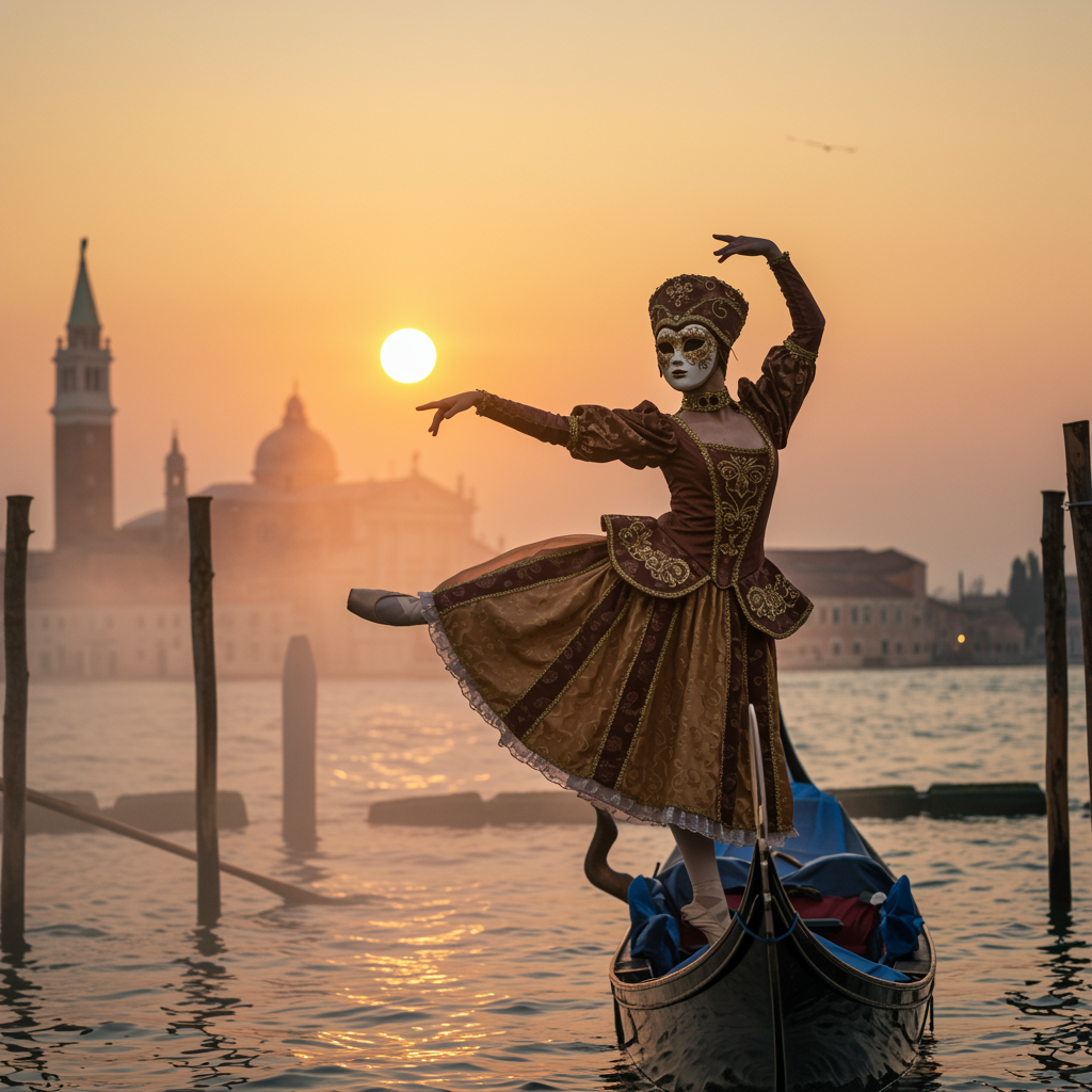 Ballerina with flowing movements, adorned in an elaborate Venetian carnival costume, her face partially obscured by an intricately designed mask. She stands gracefully on a Gondola gliding through the still waters, enveloped in a gentle cinematic mist. Above, the sky is clear, painted in shades of orange and pink as the sun sets, its large orb casting a warm, ethereal glow. Her pose, strong and elegant, resembles a statue flexing against the vibrant backdrop, evoking a timeless beauty. The scene is reminiscent of a moment captured on Kodak Portra 800 film, with rich colors and soft textures enhancing the dreamlike quality.