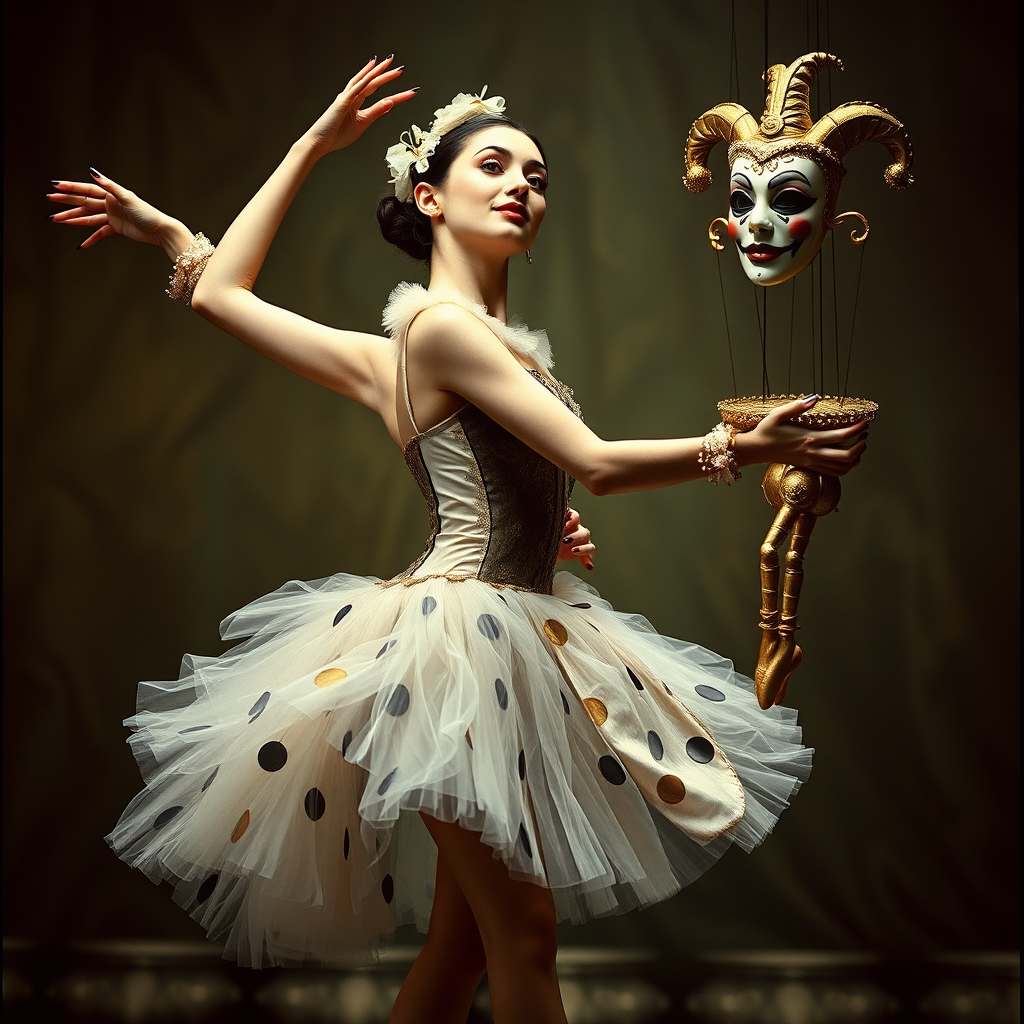 Ballet dancer, elegant woman, alluring, harlequin pattern, marionette puppet, Venetian carnival mask, shot on Kodak Portra 800 film, photorealistic style, intricate detail, aspect ratio 9:16.