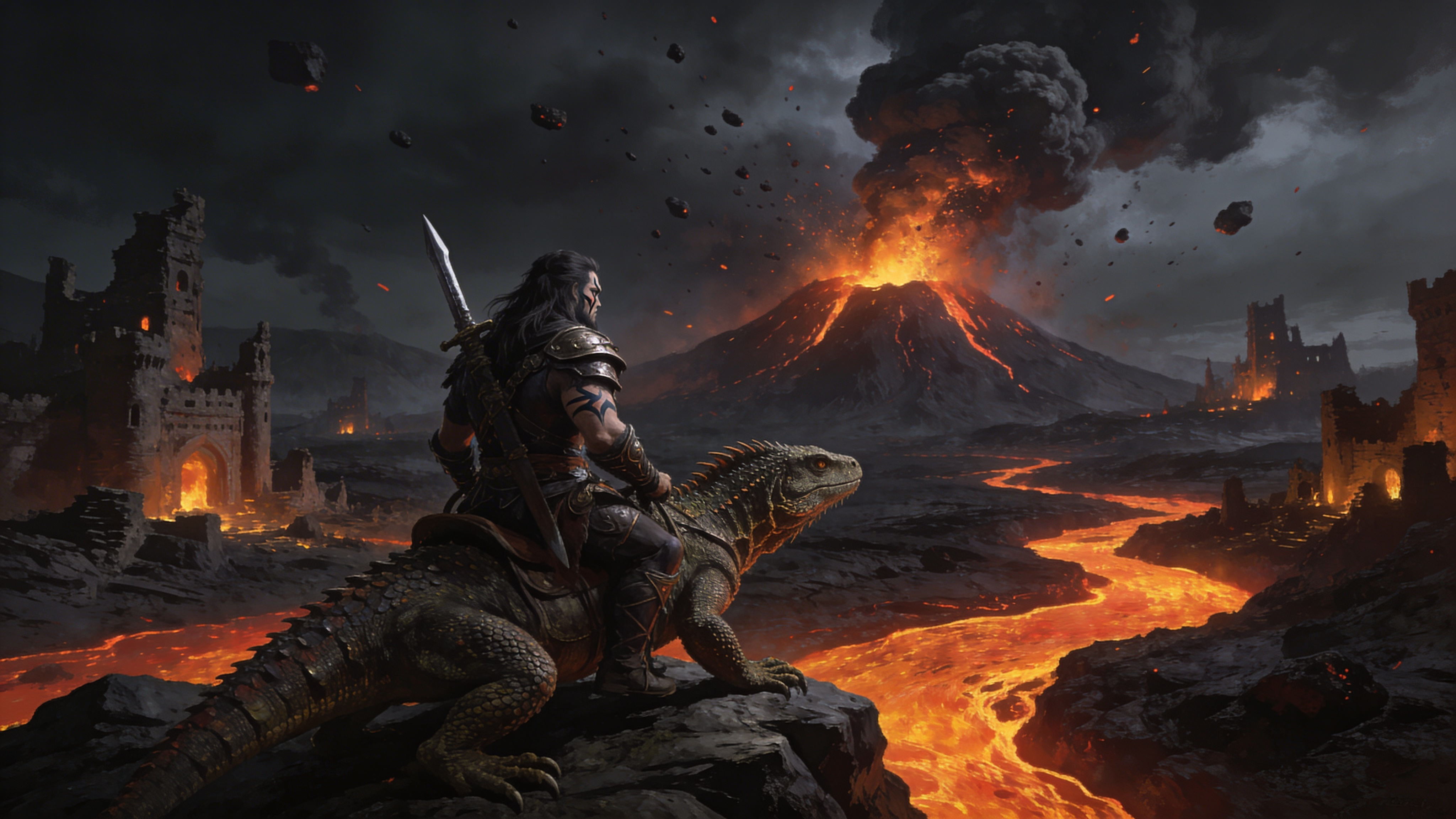 A fierce barbarian warrior, with long dark hair and war paint, riding a giant, scaled lizard mount. The warrior wears dark, battle-worn leather and metal armor, carrying a sword. They are positioned on a rocky outcrop in the foreground, gazing towards a catastrophic volcanic eruption in the midground. The sky is filled with dark, billowing smoke and falling volcanic debris. Rivers of glowing orange and red lava flow across the desolate, dark landscape, illuminating ruined ancient castles and structures scattered in the background. The art style is a dramatic, painterly fantasy illustration with photorealistic details. The lighting is dark and moody, with strong contrasts between the fiery lava and the shadowed terrain. The atmosphere is apocalyptic and grim.
