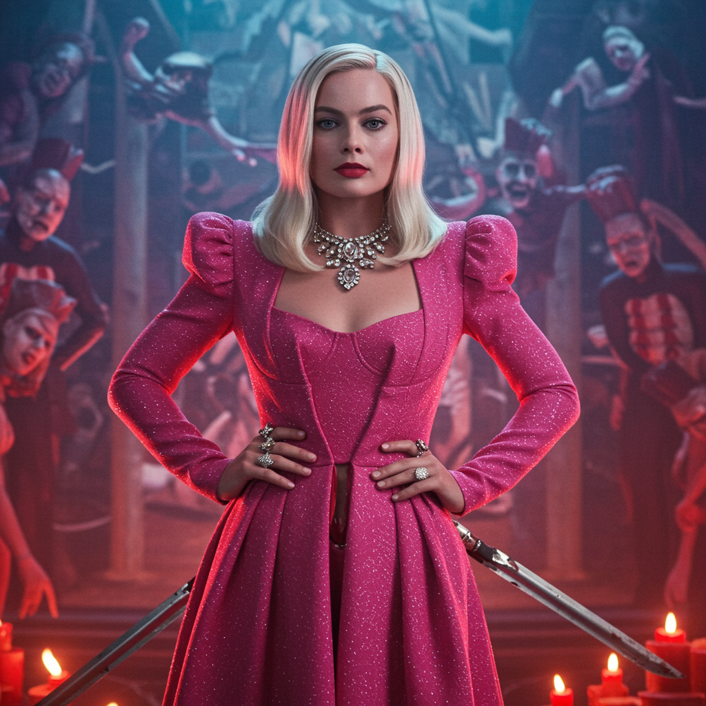 Barbie-inspired movie scene featuring Margot Robbie as a glamorous character with a touch of surreal horror, incorporating elements of the Hellraiser universe. She stands confidently in a striking pink ensemble, juxtaposed with eerie motifs reminiscent of Pinhead's iconic presence, set against a dreamlike, enigmatic backdrop. The composition blends fashion and fantasy, maintaining a vivid and imaginative aesthetic.