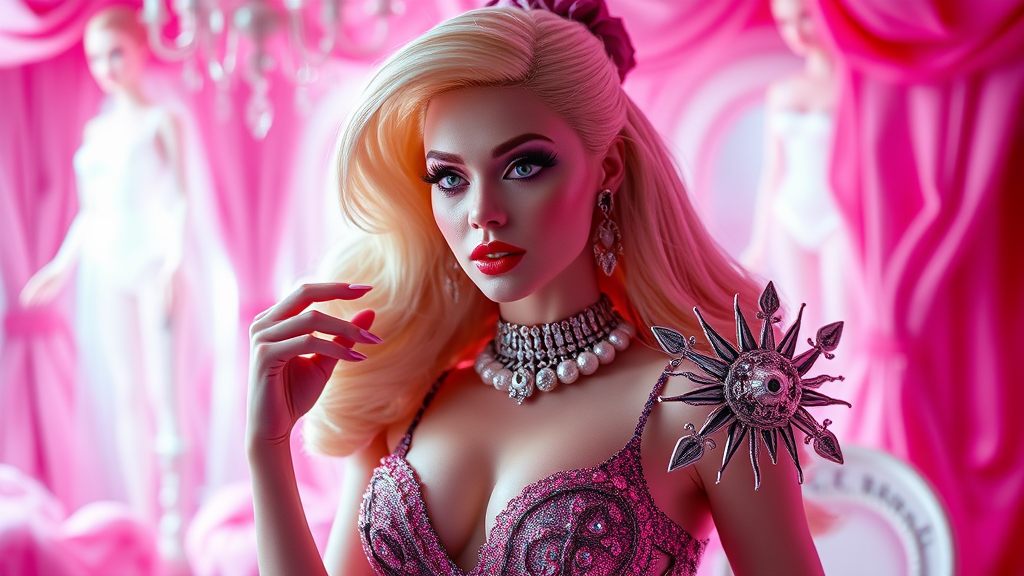Barbie movie featuring Margot Robbie infused with Hellraiser's Pinhead aesthetic, set in a surreal world of pink and elegance, blending whimsical charm with an edgy, haunting twist, showcasing a dreamlike fusion of glamour and eerie allure.