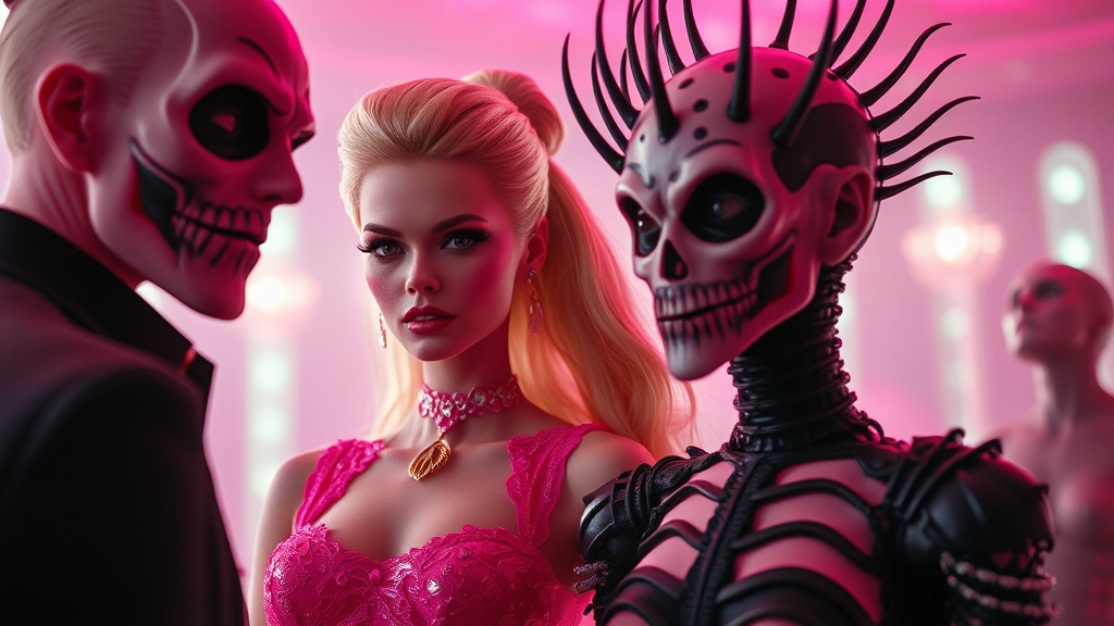 Barbie movie Margot Robbie meets Hellraiser's Pinhead in a surreal fusion, vibrant pink hues contrasting with eerie elements, a fantastical scene blending glamour and horror, cinematic elegance meets dark intrigue, tall and slender figures, captivating expressions, a dreamlike crossover with a touch of whimsical madness, set against an ethereal backdrop, 4:5 aspect ratio, high detail and visual intensity.