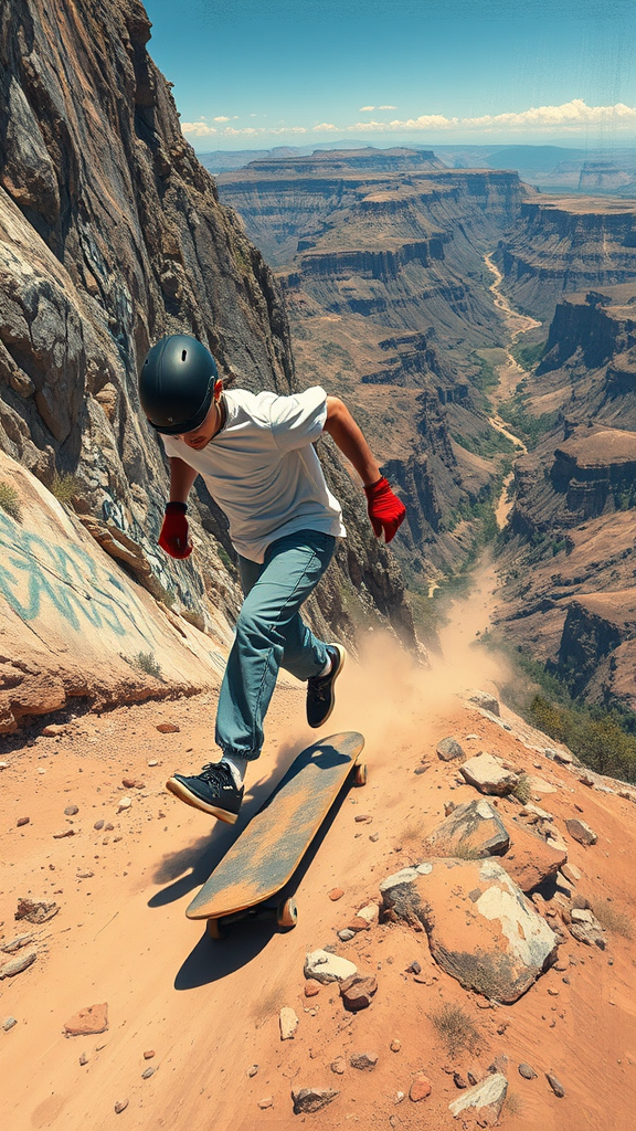 barely legible graffiti mars the mountain's rugged face as a lone free skater dashes down the treacherous slope wearing a black full face helmet, a loose white T-shirt clinging to their sweaty torso, and denim jogger pants tucked into knee-high socks, red protective gloves a stark pop of color against the dusty, sun-baked terrain, Nike SB skate shoes gripping the board as it careens over roots and around boulders, the skater's figure a blur of speed and motion, a fleck of fluttering dust trailing behind like a comet's tail, the mountain's imposing bulk and scenic canyons providing a dramatic backdrop to the fleeting moment, a rough, abstract quality to the painting's brushstrokes capturing the raw energy and movement of the scene, conceived with a style reminiscent of a high-speed chase, sporting a unique 9:16 aspect ratio, processed with a resolution of 750, and a virtual viewpoint of 6.0.