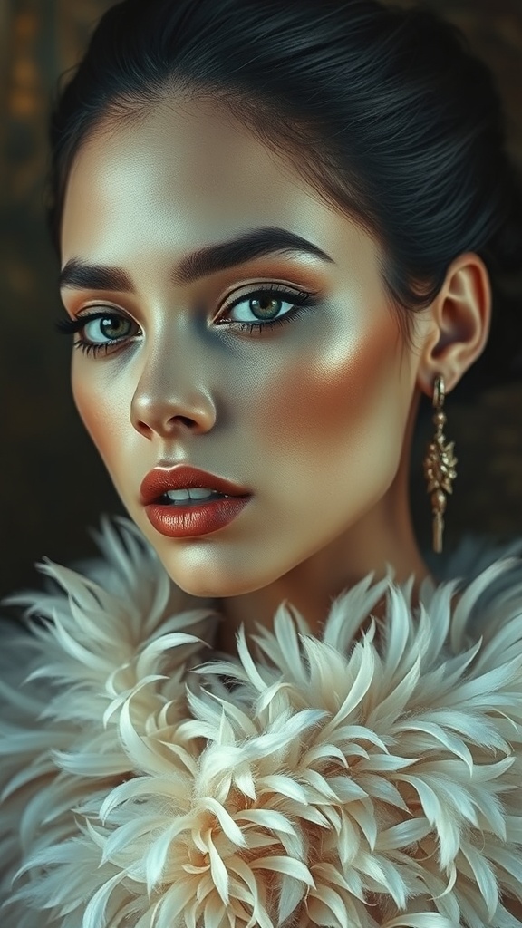 A hyper-realistic baroque portrait of Zoë Kravitz crafted entirely from an intricate tapestry of feathers, showcasing a captivating masterpiece that blends elegance and complexity. The artwork radiates the timeless grace of Tom Bagshaw's style, featuring delicate textures and rich details that highlight Kravitz's distinctive features with a modern yet classical touch.
