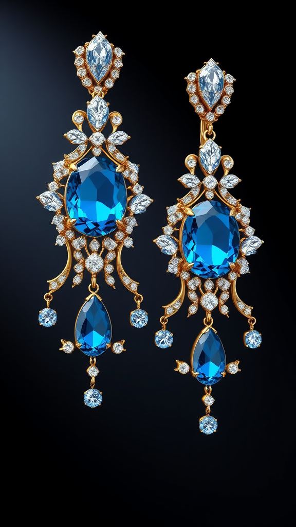 Baroque style jewelry design showcasing an exquisite pair of earrings featuring opulent blue gemstones and dazzling diamonds, rendered in high detail using V-Ray. The 18K gold setting is intricately detailed, reflecting a luxurious and classic aesthetic. The earrings are depicted against a dark background with a subtle flash to emphasize their brilliance and craftsmanship, maintaining a high-quality, high-resolution visual. The elongated proportions of the design emphasize elegance and richness, capturing the essence of timeless beauty.