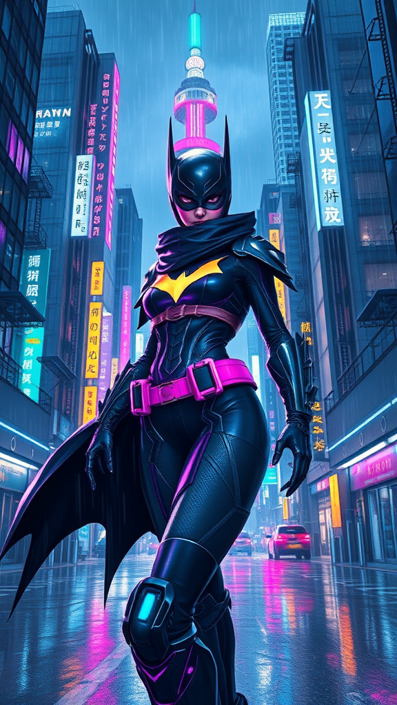 Batgirl in Tokyo cyberpunk art by Maciej Kuciara cgsociety deconstructivism darksynth behance hd dystopian art large white border Japanese type futuristic neon lights rain-soaked streets towering skyscrapers vibrant holograms intricate technological details dynamic pose shadowy atmosphere urban landscape vibrant color palette sleek design mysterious allure.