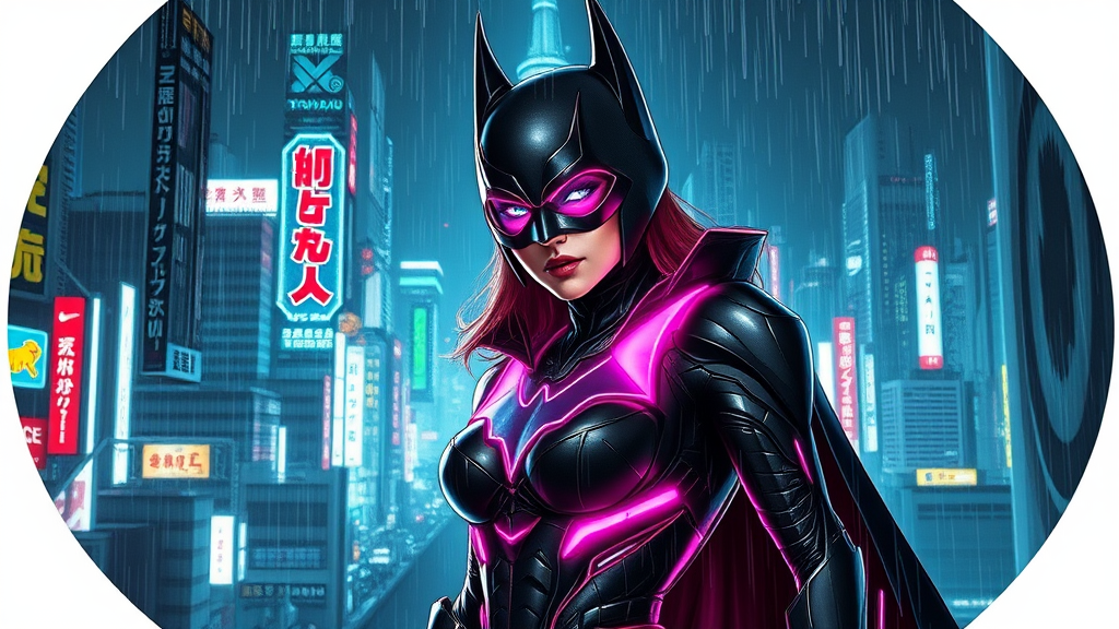 batgirl in tokyo cyberpunk art by Maciej Kuciara cgsociety deconstructivism darksynth behance hd dystopian art large white border all round overlay Japanese type vibrant neon lights futuristic skyline intricate cityscape glowing holograms sleek costume dynamic pose digital rain textured surfaces enigmatic atmosphere immersive storytelling