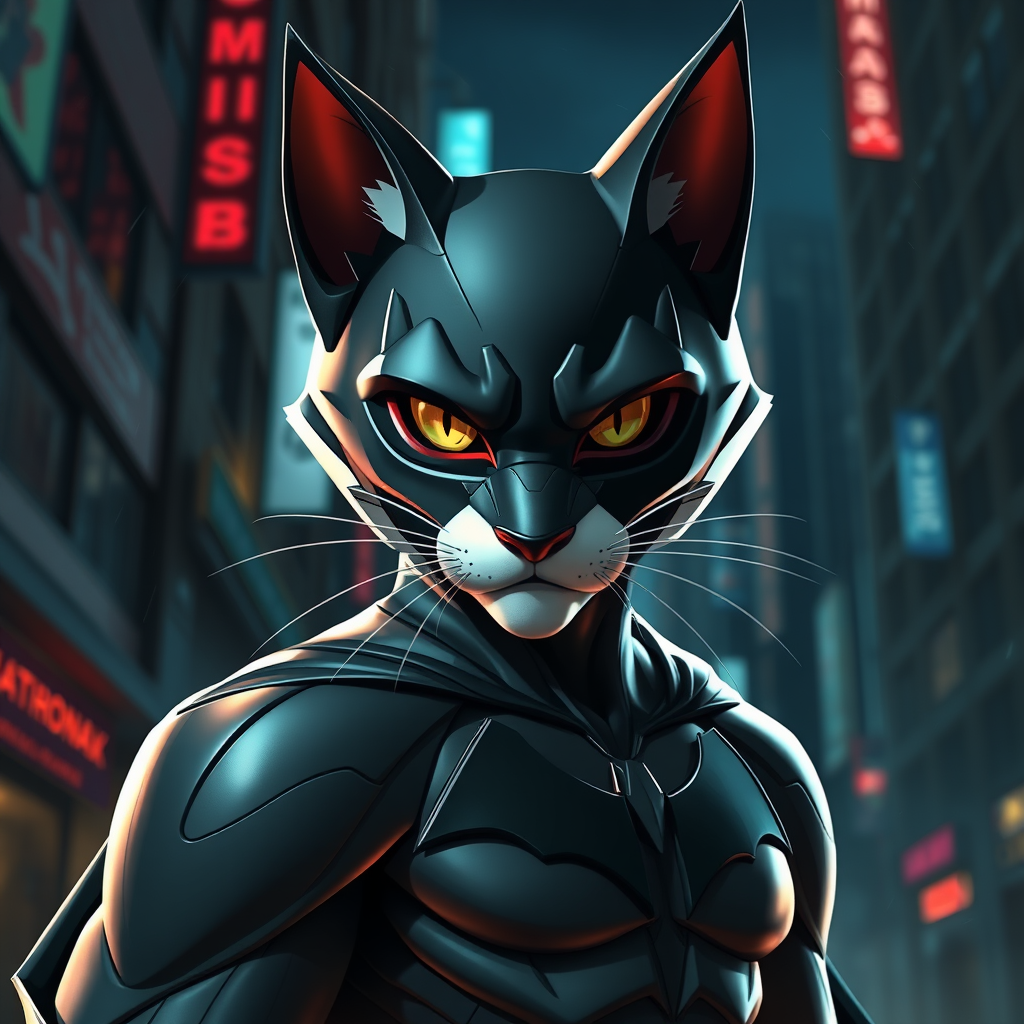 batman-cat hybrid, highly detailed, cinematic animation feel, ultra-realistic 8k resolution, dramatic shadows, sleek and dynamic pose, mysterious urban backdrop with neon lights, fierce yet graceful demeanor, intricate textures and profound expression