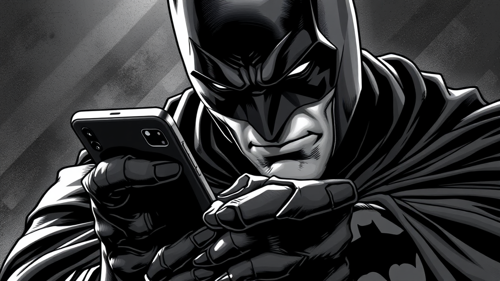 Batman clutching a smartphone, rendered in a dramatic black and white portrait style, showcasing hyper-realistic detail with a close-up intensity. Channel the bold lines reminiscent of Rob Liefeld, infused with the evocative atmosphere of George Stefanescu and Nathan Wirth. A homage to the intense expressions of superheroes, captured in an elongated aspect ratio.