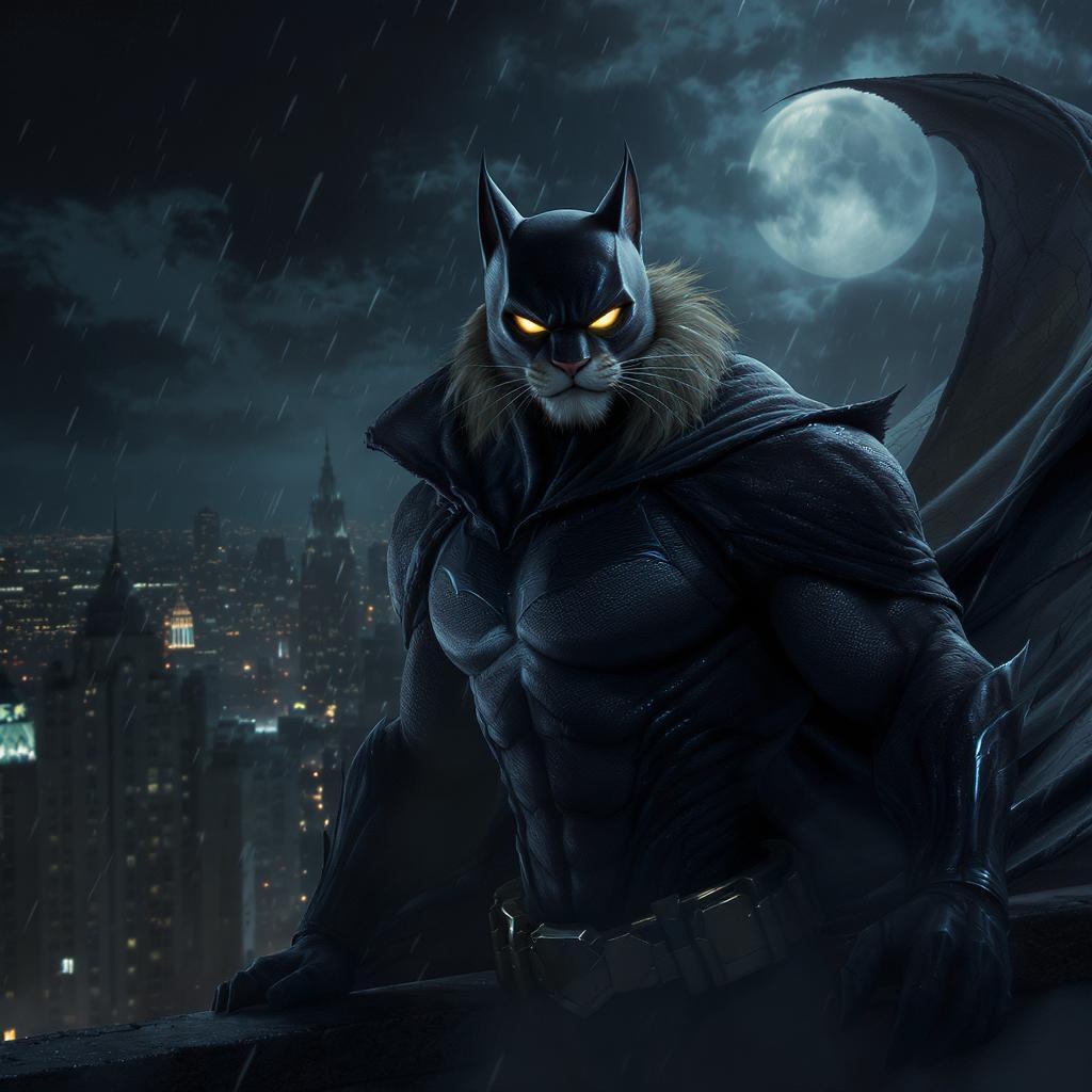 batman feline hybrid, ultra detailed, cinematic style, animated, 8k resolution, dark and mysterious cityscape, sleek suit with feline features, captivating eyes, moonlit rooftop, dynamic pose, dramatic lighting, atmospheric shadows, vivid textures, fluid motion, epic ambiance