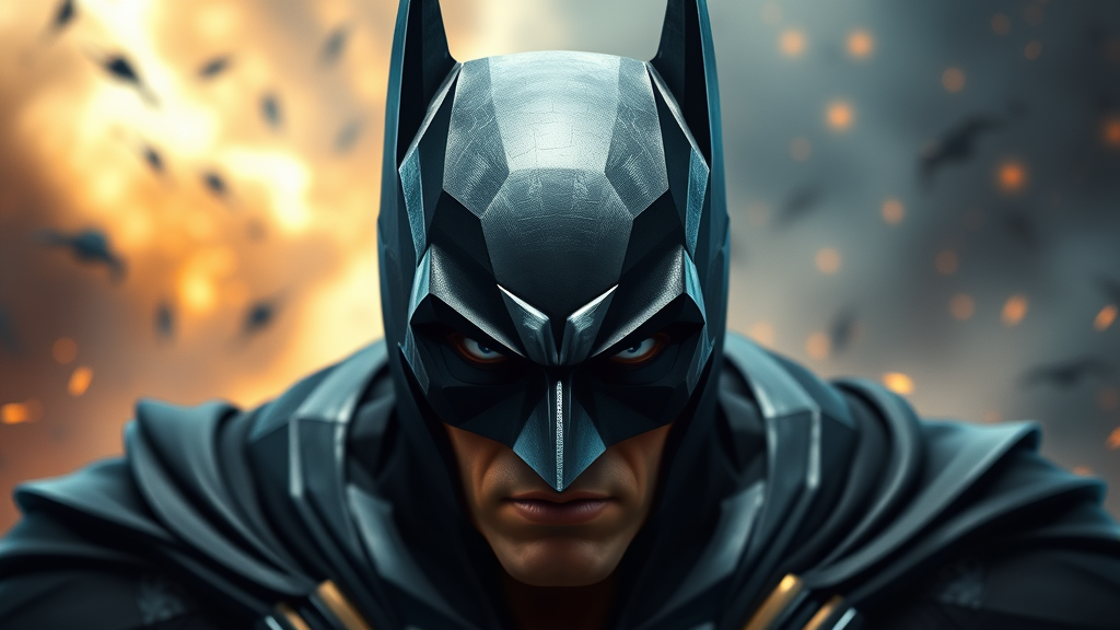 Batman glares intensely at the viewer, surrounded by a dramatic, dynamic backdrop, depicted in a masterpiece of monumental proportions, rendered in a striking low-poly style, free of signatures, watermarks, usernames, or any low-resolution artifacts, showcasing high clarity and crisp details, perfectly framed in a tall 9:16 aspect ratio, with heightened contrast and saturation to enhance the visual impact.