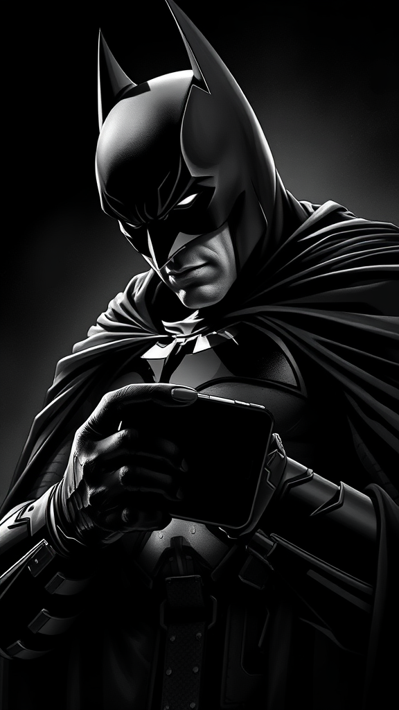 Batman gripping a smartphone, captured in a dramatic black and white portrait with realistic hyper-detail. The scene radiates close-up intensity, reminiscent of a Rob Liefeld comic panel, evoking the artistry of George Stefanescu and Nathan Wirth. Batman stands as a superhero symbol, shadows emphasizing his formidable presence, the phone glowing softly as a beacon amidst the darkness.