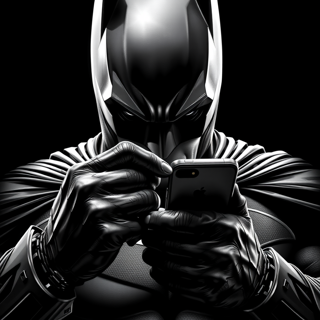 Batman gripping a smartphone, captured in the style of dramatic monochrome portraits, featuring realistic hyper-detail, with influences from Rob Liefeld's dynamic intensity, George Stefanescu's piercing clarity, and Nathan Wirth's evocative lighting. The close-up shot emphasizes the superhero's determination and resolve, highlighting every sharp contour and intricate texture of the suit and device, set against a stark contrast backdrop.