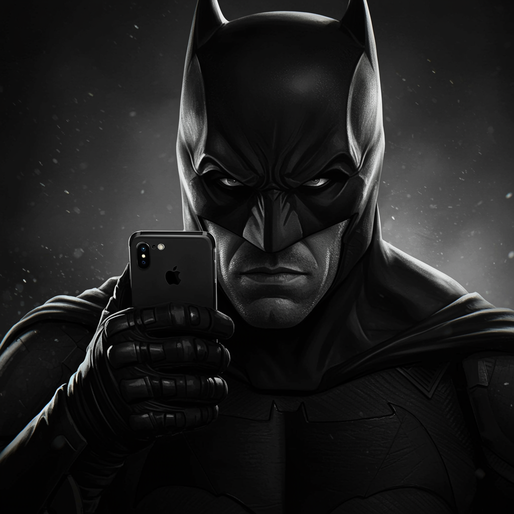 View this AI-generated image featuring batman gripping a smartphone captured in a dramatic black and white portrait style rendered with hyper realistic detail evoking the bold and intense techniques reminiscent of rob liefeld the close up shot exudes an intensity akin to the works of george stefanes