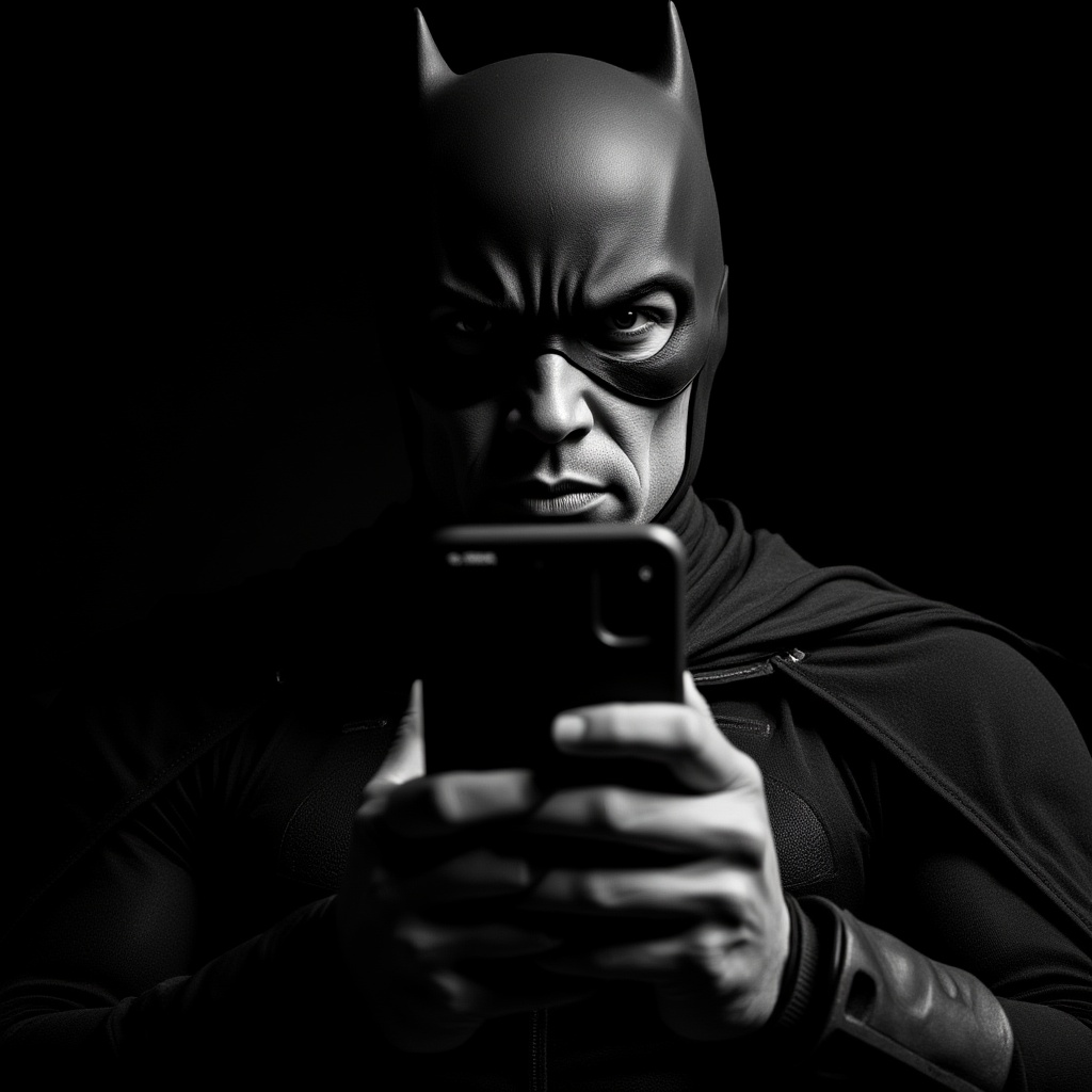 View this AI-generated image featuring batman gripping a sleek smartphone rendered in a dramatic black and white portrait style with hyper realistic detail inspired by rob liefeld s bold intensity capturing the enigmatic expression and determined gaze of the superhero the scene evokes the moody atmo
