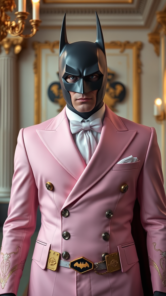 Batman in a pastel pink suit, with a gothic and gold-accented design, standing in an elegant neoclassical setting, captured in a cinematic style reminiscent of Wes Anderson's masterpiece. The scene is realistic, shot with a Leica 50 mm lens, featuring dramatic lighting. Batman, with highly detailed and distinct facial features, gazes intently at the camera. The image is rendered using Unreal Engine with Octane Render for an immersive effect. His eyes are incredibly detailed, as is his intricately decorated suit, reflecting a touch of surreal heroism amidst the elegance.