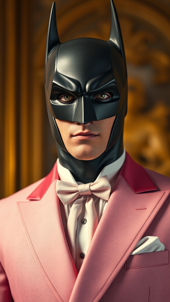 Batman in a pastel pink suit, with a gothic and neoclassical influence, exuding elegance and cinematic flair, captured in a shot reminiscent of Wes Anderson's style. The composition is a masterpiece, photographed with a Leica 50mm lens, emphasizing dramatic lighting that accentuates the scene. Batman is staring directly at the camera, his facial features highly detailed and expressive, enhanced with Unreal Engine and Octane Render for a hyper-realistic effect. The suit is exquisitely detailed, with intricate patterns woven into the fabric, and his eyes are captivatingly detailed, drawing the viewer into his intense gaze. The background blends rich gold and warm tones, contributing to the overall grandeur and sophistication of the image.
