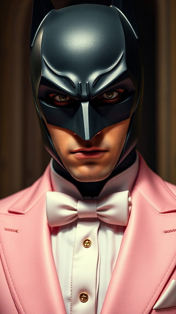 Batman in a pastel pink suit with gothic gold detailing, embodying an elegant yet neoclassical style. The scene is reminiscent of Wes Anderson's cinematic mastery, captured through the lens of a Leica 50mm camera. Batman's stare is direct and intense, his highly detailed facial features accentuated by dramatic lighting. His eyes are remarkably detailed, revealing depth and mystery. The suit is intricately crafted, each stitch and texture visible, brought to life in Unreal Engine with Octane Render for a hyper-realistic finish.