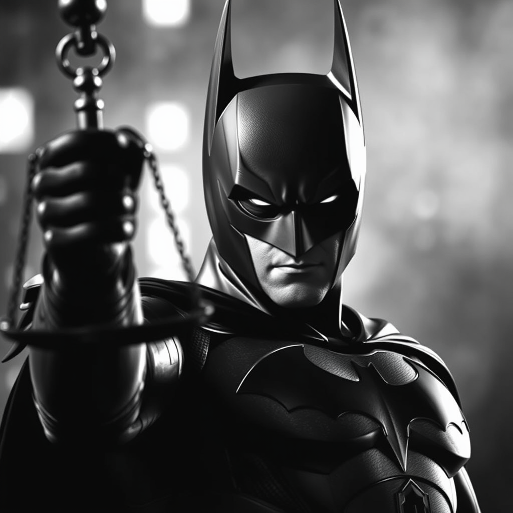 Batman-inspired dark justice, monochrome imagery, digitally enhanced shadows, modern times, black and shades of gray.