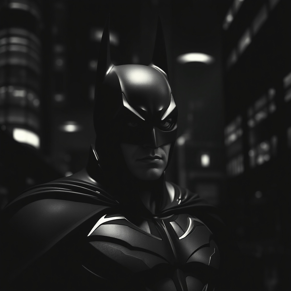 View this AI-generated image featuring batman noir monochrome imagery digital enhancement intense contrast adjustment modern setting deep black and varied gray tones. Created using advanced AI technology, this image showcases creative visuals, AI artwork. Perfect for creative projects, digital art,