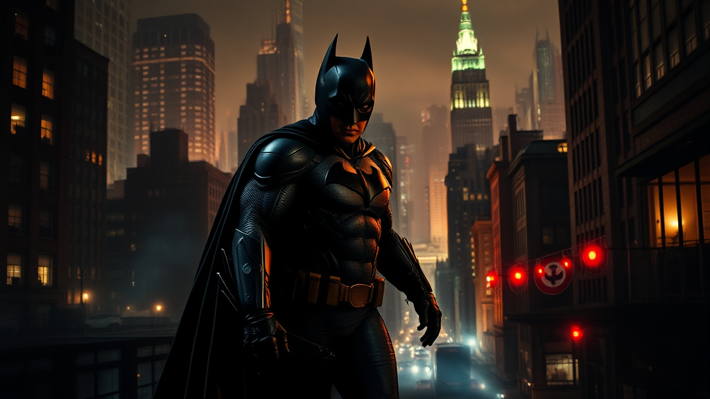 Batman prowls the shadowy streets of Gotham City under the cloak of night, the entire scene evoking the tense atmosphere of Christopher Nolan's dramatic style. The cityscape is alive with the chilling echoes of horror and the pulse of impending danger. The dramatic lighting casts deep shadows and unexpected highlights, revealing hidden details in every corner of the hyper-realistic, ultra-high-definition panorama. The image is teeming with colorful realism, encapsulating both the beauty and dread of the city's darkened alleyways. Each detail is intricately rendered in 8K, capturing the essence of life-saving heroics in a world teetering on the brink of chaos.