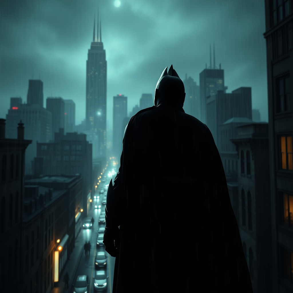 Batman silhouetted against the towering skyline of night-shrouded Gotham City, the scene rich with the moody intensity of a Christopher Nolan film, unfolding in a landscape of darkness and suspense. The atmosphere crackles with urgency and tension, as dramatic lighting highlights the city’s gothic architecture and grim alleys. Hyper-realistic details bring every rain-soaked street, every distant siren echo, and every shadow-draped figure to life, capturing a vivid tapestry of color and gritty realism. Hidden within this layered scene are subtle details that whisper of the city's secrets and the hero's relentless quest, presented in stunning UHD, 8K resolution.