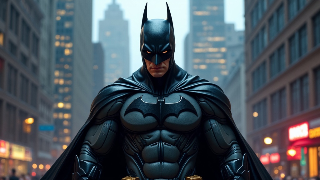 View this AI-generated image featuring batman stands tall piercing eyes locked onto the viewer set against a dramatic and dynamic cityscape backdrop rendered in a masterpiece of gigantic scale and low poly art style the scene captures the intensity and mystique of gotham city highlighting the stark
