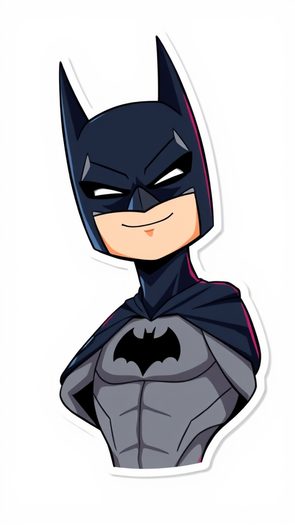 Batman sticker with a playful smirk, rendered in a minimalist anime style, featuring sleek lines and a limited color palette, capturing a modern and trendy vibe, perfect for spotlight on ArtStation, with an aspect ratio of 2:3. Incorporate subtle dynamic elements and a touch of vibrant accents for added flair.
