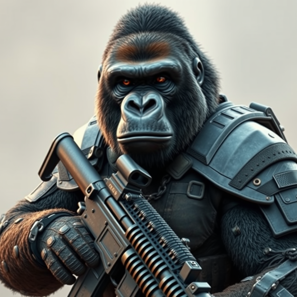 Battle-hardened gorilla, clad in advanced military armor, wielding a sleek carbine rifle, displaying a commanding anthropomorphic stance, incredible detail, ultra hd, 8k resolution, lifelike portrayal, exquisite facial detail, dramatic cinematic lighting, vigilant gaze.