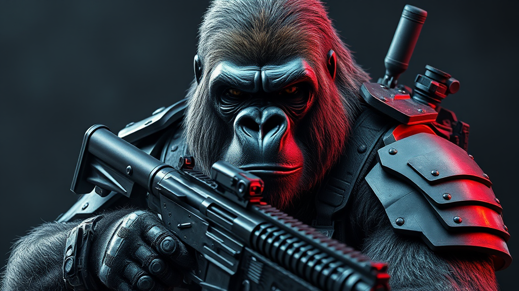 Battle-hardened gorilla clad in intricate military armor, wielding a sleek carbine rifle, exuding an intense and commanding presence, hyper-realistic and lifelike, showcasing extraordinary detail in facial features, set against dramatic cinematic lighting, with a focus on ultra HD clarity and super resolution, vertical composition.