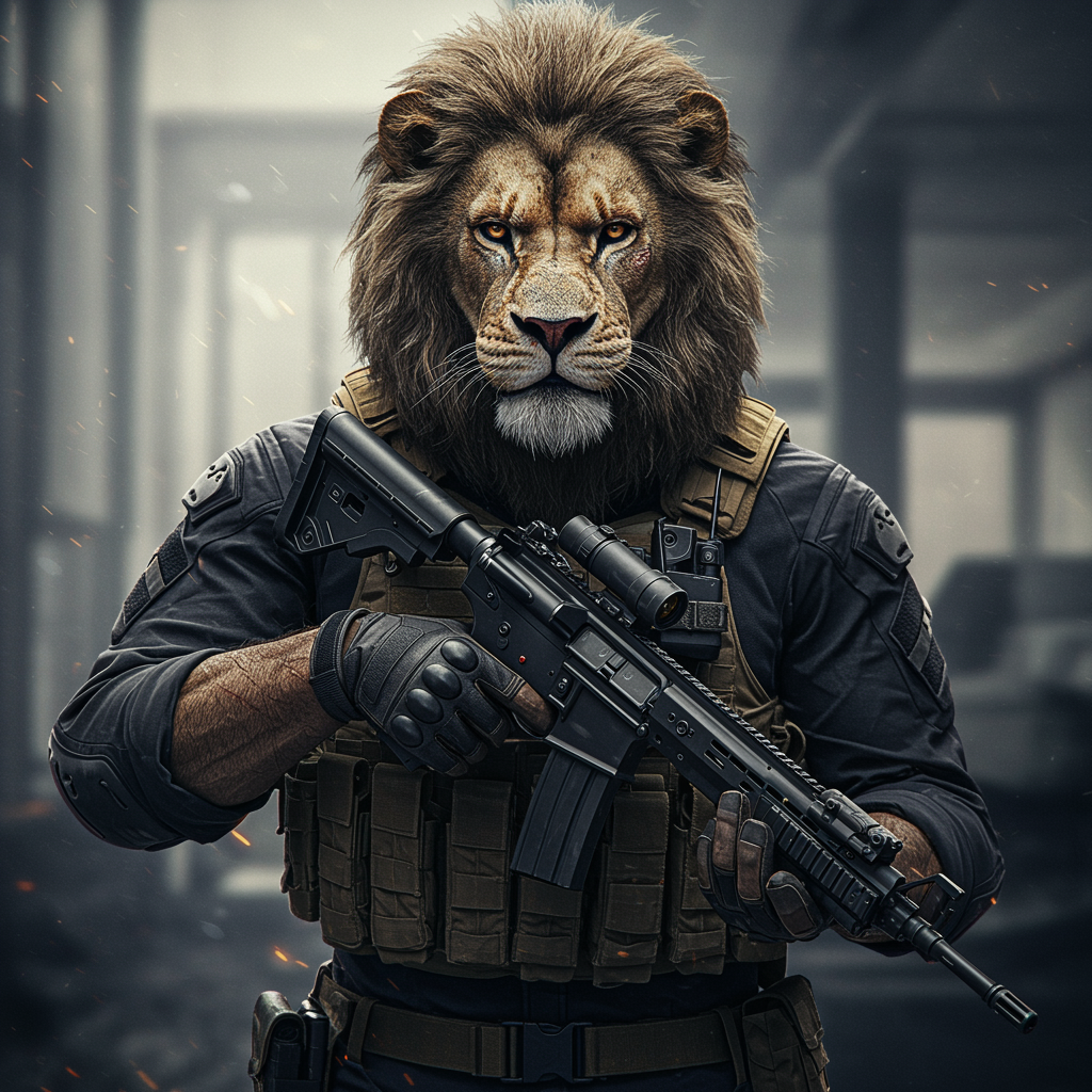 A fierce, battle-hardened lion with an intense gaze, clothed in a tactical black ops uniform, wielding a sleek carbine rifle. This anthropomorphic warrior exudes power and determination, with scars etched across its majestic face, showcasing tales of countless battles. The scene is captured in breathtaking, ultra-high-definition and 8k resolution, with every facial detail rendered to perfection. Cinematic lighting casts dramatic shadows, accentuating the lion's muscular form and the intricate details of its attire, all set against a backdrop that amplifies its commanding presence.