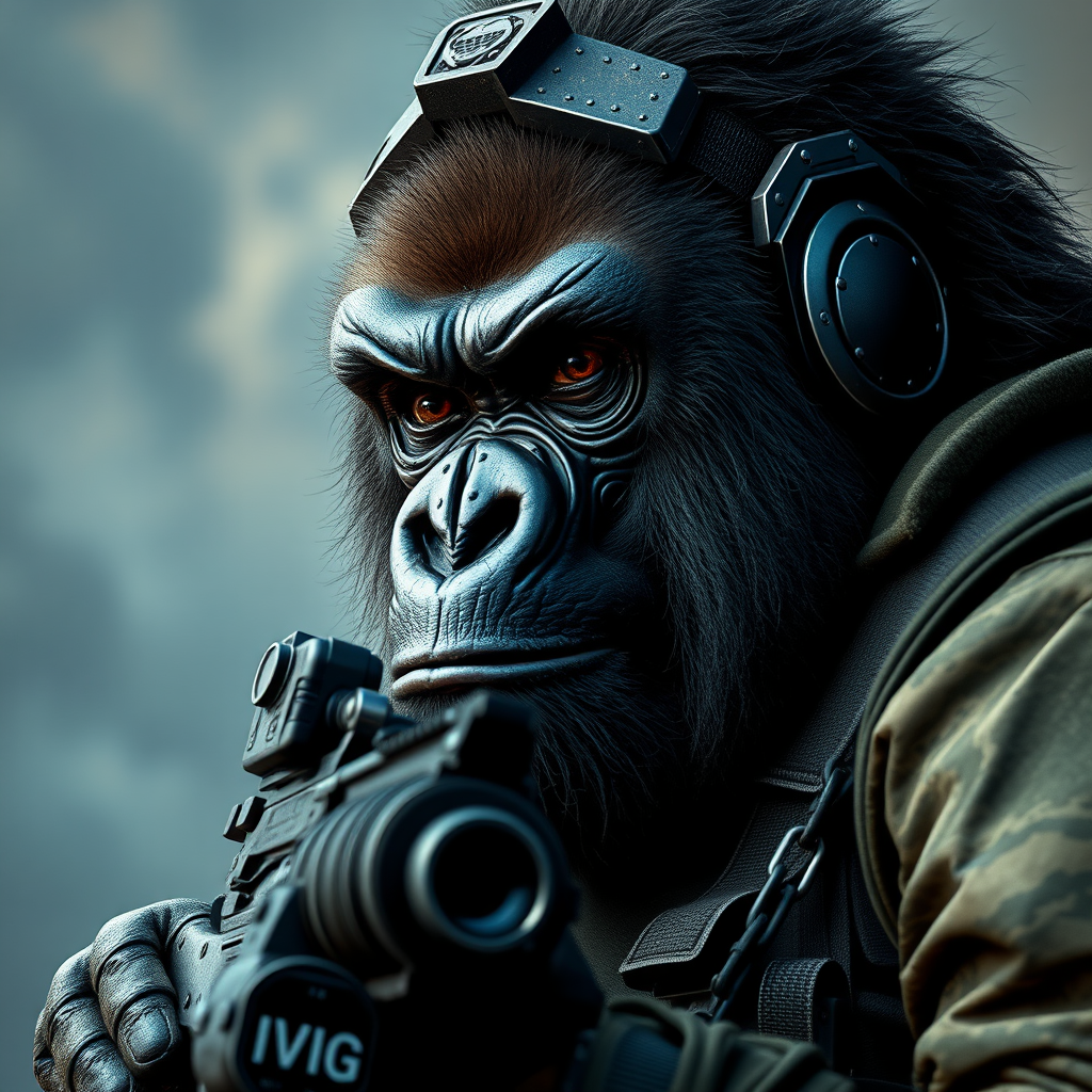 Battle-ready gorilla clad in advanced military gear, gripping a tactical assault rifle, human-like characteristics, exceptionally detailed, ultra hd, 8k resolution, hyper-realistic, intricate facial expression, dramatic lighting, vertical aspect ratio with a cinematic flair, subtle imaginative adjustments enhancing the original theme.