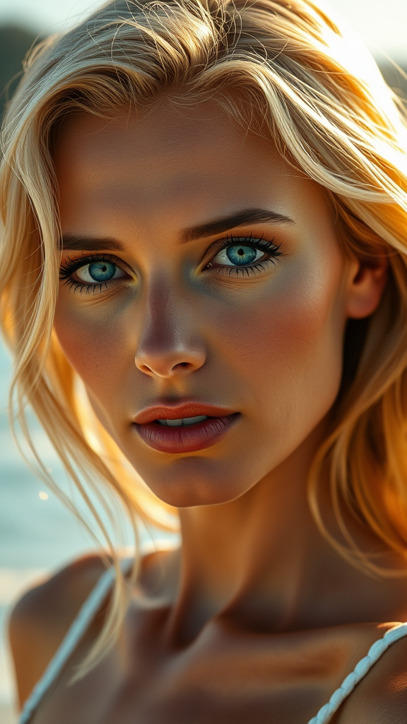 Beach photo shoot, Studio lighting. Portrait of an elegant blonde woman in her 30s, striking blue eyes, intricate artistry reminiscent of Joaquin Sorolla, gentle natural light, warm sunlight kisses her face, cinematic illumination, luminous reflections, photography in a breathtaking setting, Hyperrealism, cgi, octane render, raytracing, Photorealism, intricate details, HDR, 8K resolution, RTX rendering, captured with a Sony A7R III, Rokinon RK50M-E 85mm F1.2 lens, Auto-White Balance. --ar 4:7