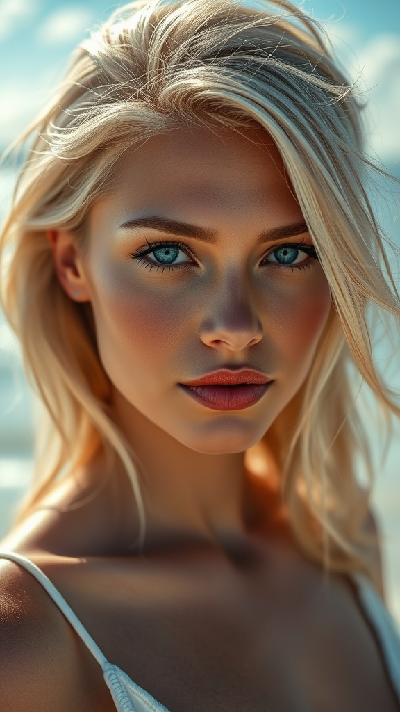 Beach photoshoot, Studio illumination. Portrait of a stunning blonde woman in her 30s, with striking blue eyes, evoking the intricate artistry of Joaquin Sorolla. Soft, natural light and sunshine caress her face, enhanced by cinematic lighting and luminous reflections. Captured in a breathtaking setting, the scene embodies Hyperrealism with CGI precision, octane render, and raytracing. Showcasing photographic realism, the image features extreme details in HDR, 8K quality, using an RTX-capable setup, a Sony A7R III camera with a Rokinon RK50M-E 85mm F1.2 lens, achieving perfect balance with Auto-White Balance.