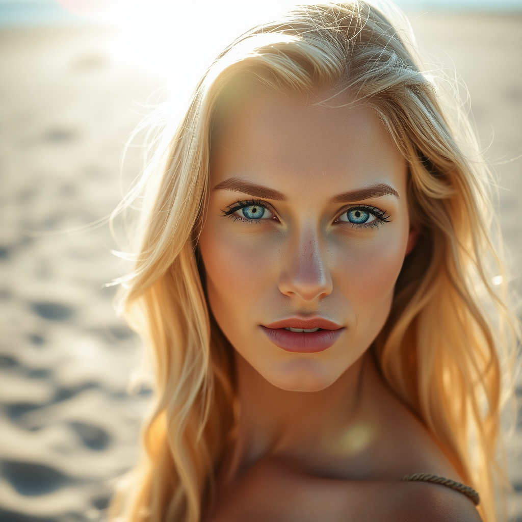 Beachside portrait photoshoot, Studio-like illumination. Captivating portrait of a radiant blonde woman in her 30s, with piercing blue eyes, inspired by the intricate artistry of Joaquin Sorolla. Bathed in soft, natural light, the sun gently caresses her face, creating a cinematic play of light. Luminous reflections enhance the scene, captured in a stunning environment. Hyperrealistic details achieved through CGI techniques, octane rendering, and raytracing. Photorealism in extreme detail, utilizing HDR effects, with an 8K resolution using a Sony A7R III paired with a Rokinon RK50M-E 85mm F1.2 lens. Auto-white balance ensures true-to-life colors. Composition aspect ratio set at 4:7.