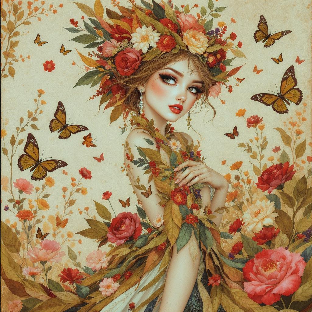Beautiful aesthetic featuring a Russian girl with intricate and super detailed artistic elements. She has a slender body adorned in a dress made of leaves, surrounded by vibrant flowers and delicate butterflies. The dynamic composition captures a vivid and colorful palette in a vintage style. Her expressive eyes are framed by long eyelashes, emphasizing her natural elegance. A UHD, HDR, 8K resolution enhances the scene, ensuring clarity and detail in every aspect. The setting is minimal yet full of life, incorporating plants that blend seamlessly with her attire. Avoid any aspects of disfigurement or distortion to maintain the beauty and cohesion of the scene. Keep the focus on the natural aesthetic and intricate details, avoiding low resolution, out-of-frame elements, or digital artifacts.