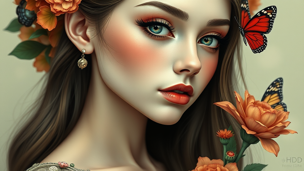 Beautiful Aesthetic, Intricate Detail, Artistic, Fantastic, Vintage Style, Vivid, Colorful, Minimal, Russian girl, Eyelashes, Slender figure, leaf dress, flower, butterfly, plant, seated, dynamic composition, UHD, HDR, 8K, excluding disfigured or distorted aspects, refined facial features, balanced eyes, elegant neck, accurate anatomy, clear resolution, in-frame, sharp image, without artifacts or logos, realistic portrayal.