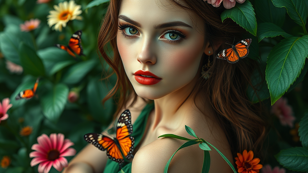Beautiful Aesthetic, Intricate Detail, Artistic, Fantastic, Vintage Style, Vivid, Colorful, Minimal, Russian girl, Eyelashes, Slender body, leaf dress, flower, butterfly, plant, sit, dynamic composition, UHD, HDR, 8K, capture, By, detailed artistry, vibrant colors, seamless design, lush greenery, expressive gaze, harmonious elements, elegance, nature-inspired, captivating scene, flattering posture, clear focus, refined features, compelling portrait, intricate floral arrangement, graceful motion.