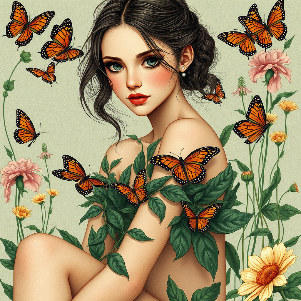 Beautiful aesthetic, intricate detail, artistic, vintage style, vivid, colorful, minimal, Russian girl, eyelashes, slender body, dressed in leaves, surrounded by flowers and butterflies, dynamic composition, plants, sitting gracefully, UHD, HDR, 8K, captivating and clear visual, emphasizing elegance and nature, harmonious elements, natural beauty, refined composition, maintained clarity and focus, avoiding distortions and distractions.