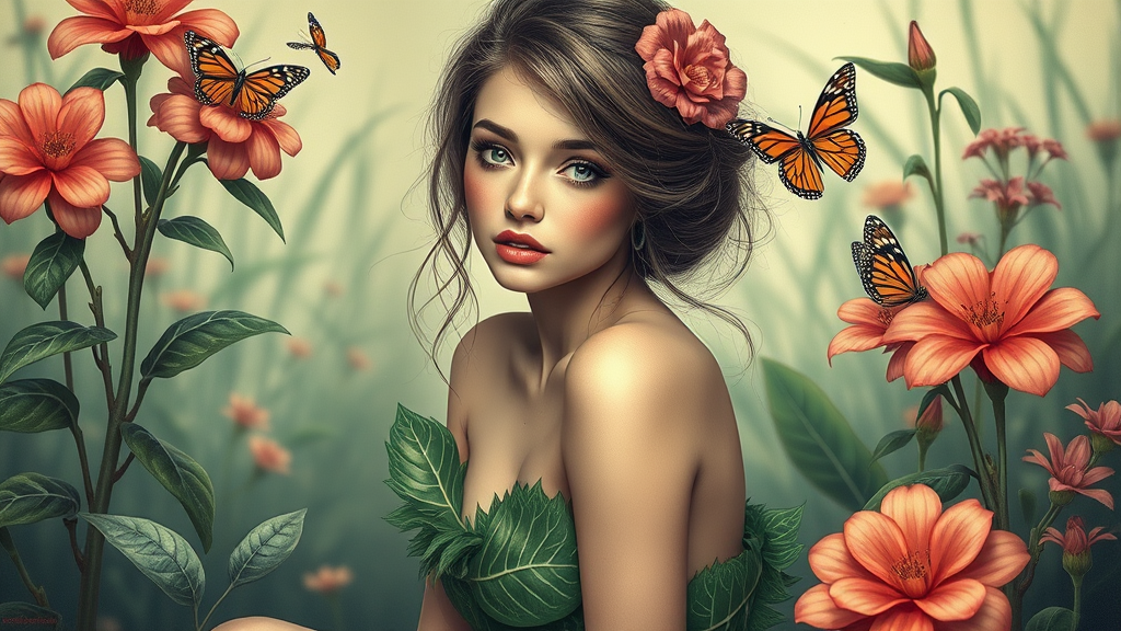 Beautiful Aesthetic, Intricate Detail, Super Detail, Artistic, Fantastic, Vintage Style, Vivid, Colorful, Minimal, Russian girl, Long Eyelashes, Slender Body, Leaf Dress, Flower, Butterfly, Plant, Sitting, Dynamic Composition, UHD, HDR, 8K, Inspired By Nature, Elegance, Graceful Movement, Vibrant Environment, Harmony, Exquisite Form, Delicate Touch, Serene Expression, Enchanting Atmosphere, Symmetry, Organic Flow, Light Play, Realism, Whimsical Touch.