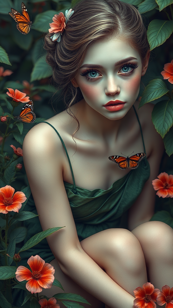 Beautiful aesthetic, intricate detail, super detail, artistic, fantastic, vintage style, vivid, colorful, minimal, Russian girl, eyelashes, slender body, leaf dress, flower, butterfly, plant, sitting in dynamic composition, UHD, HDR, 8K, balanced composition, enchanting gaze, harmonious features, natural elegance, ethereal presence, botanical surroundings, vivid color palette, graceful pose, captivating atmosphere, untouched, clear resolution, seamless edges, refined lines, pure artistry, flawless execution, lifelike portrayal, imaginative scenery, refined details.