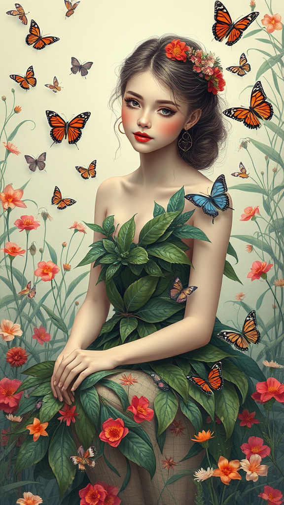 Beautiful aesthetic, intricate detail, super detail, artistic, fantastic, vintage style, vivid, colorful, minimal, Russian girl, eyelashes, slender body, wearing a dress made of leaves, surrounded by flowers, butterflies, and plants, sitting gracefully, dynamic composition, UHD, HDR, 8K, captivating yet natural expression, enhanced setting, harmonious color palette, ethereal elegance. Avoid elements such as duplication, disfigurement, mutation, deformation, undesirable facial features, unnatural proportions, low resolution, image distortion, or unwanted text and artifacts.