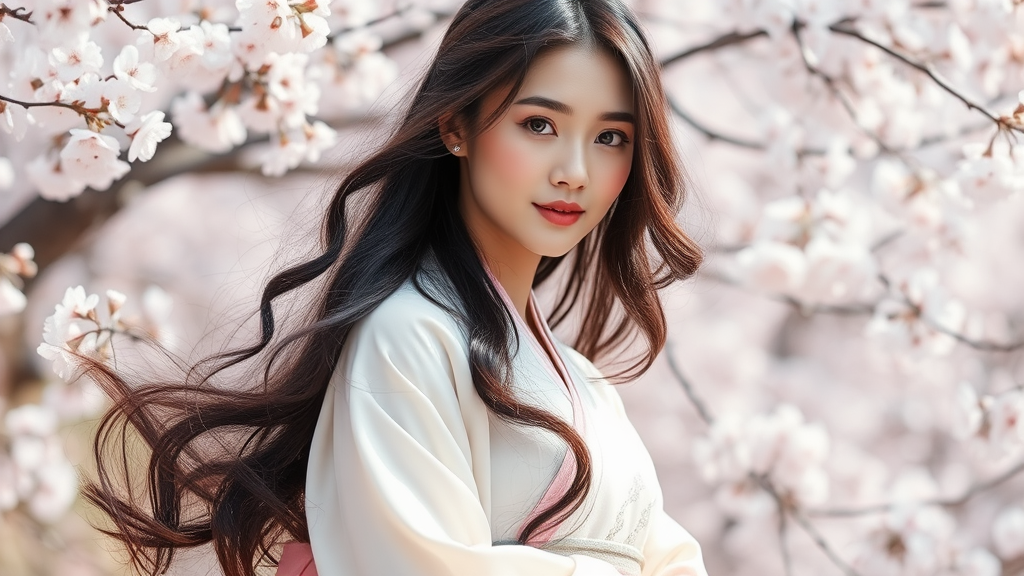 Beautiful and elegant Korean woman, graceful and poised, exuding a serene confidence, her dark, lustrous hair cascading gently, eyes shimmering with kindness and intelligence, skin glowing with a natural radiance, dressed in a flowing, traditional hanbok, the delicate fabric adorned with intricate patterns, standing amidst a tranquil landscape of cherry blossoms, a gentle breeze playing with the petals, embodying the harmony and beauty of nature.