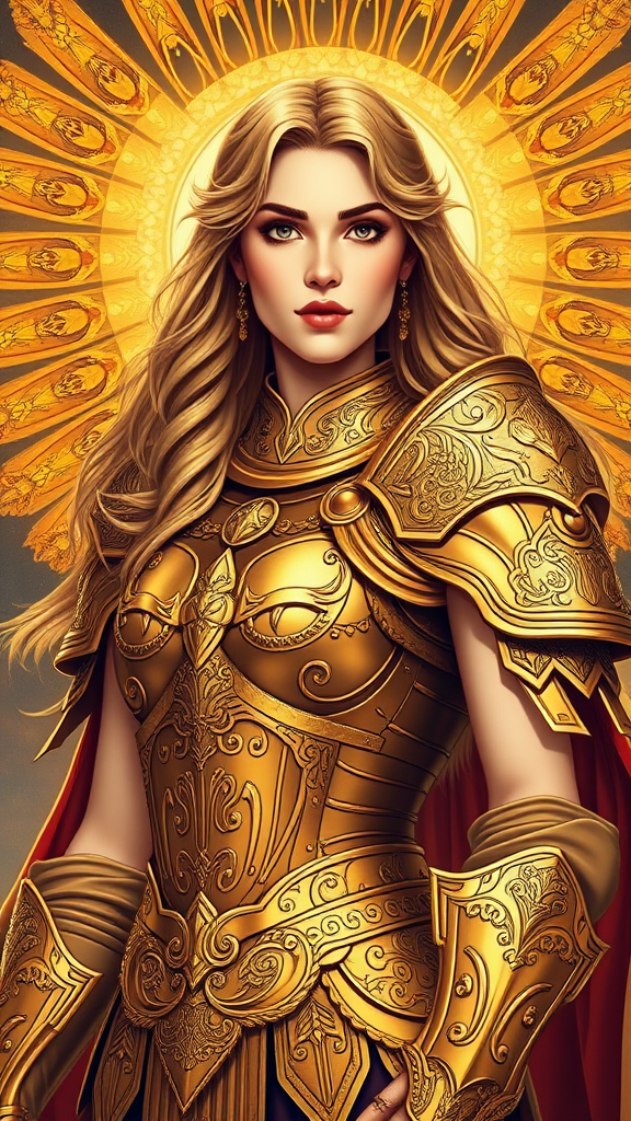 Beautiful and powerful woman in radiant golden armor, showcasing a full-body view with ideal proportions, a flawless face, and immaculate hair. The design features perfect intricate details, with ornate, high-resolution artistry reminiscent of a detailed poster. The imagery is crafted with the finesse of a detailed illustration and the richness of an octane render, blending the evocative styles of Johanna Rupprecht and the classic patterns of William Morris. This captivating artwork is a trending piece on art platforms, combining historical elegance with modern creativity.
